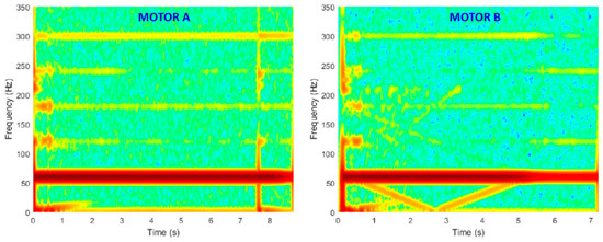 Several High Voltage (H.V.) cage motors were diagnosed in a water intake facility [41]. To this end, starting current analyses were employed. The results revealed that all diagnosed motors had a certain level of damage in their rotor cages. However, the severity of the damage significantly changed from one motor to another. Figure 8 shows the time-frequency analyses for two of the diagnosed motors: while the motor A was diagnosed as healthy (no fault components evolutions were found in the time-frequency map), motor B was diagnosed with a severe level of rotor failure (see clear V-shaped pattern caused by the transient evolution of the f·(1 − 2·s) component). This latter motor was inspected in the repair shop and a significant number of broken bars were found in the rotor cage (more than 1/4 of the rotor bars were damaged) [41]. On the other hand, note how the time-frequency map for motor A shows a vertical line that is indicative of the commutation of the supply voltage under starting (the motor was started using an auto-transformer). This example clearly shows how the approach is highly reliable to detect rotor damages in cage motors.
