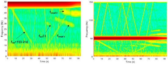 Several cage induction motors of a sewage treatment plant were diagnosed by applying the transient-based current methodology. Figure 9 depicts the time-frequency analyses for one of these motors (considering two different frequency ranges in the y-axis for a better visualization of the fault components). After a careful analysis of this map, it is observed that not only the components linked with rotor damages are present in that map (note the existence of the V-shaped pattern caused by the transient evolution of the f·(1 − 2·s) component), but also other evolutions corresponding to harmonics caused by other factors. In this regard, we note the presence of the evolutions linked with eccentricity components (fecc), as well as some other harmonics that are caused by problems in the coupling system (fcoupl). The presence of these harmonics enabled diagnosing, on the one hand, the existence of a slight eccentricity in the motor and, on the other hand, the presence of a certain level of degradation in the coupling system (which in this motor was based on gear reducers).