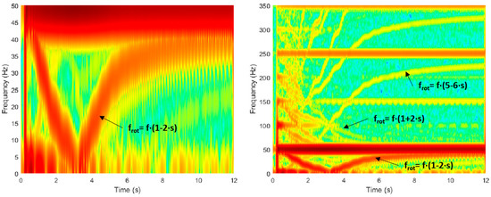 It is also important to remark that the aforementioned evolutions are valid for the case of direct on-line starting of electric motors. However, some works have proven that they are also valid under other types of starting methods [21]: startup with auto-transformer, startup with stator resistors, star-delta startup, or even soft-started motors. In this latter case, a higher harmonic content is detected in the signals, but the fault-related patterns still appear [22]. A different question arises when the motor is started via Variable Speed Drive (VSD). In that case, since the supply frequency usually changes, the patterns linked with the fault components are different, but once they are characterized, the methodology is perfectly applicable, as reported in previous works that considered motors driven by a frequency converter [23,24].