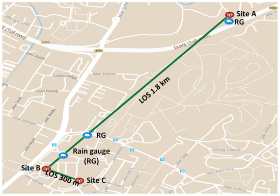 Measurement links map in Kuala Lumpur, Malaysia for 1.8-km and 300-m line-of-sight (LOS) path at 73.5 and 83.5 GHz E-bands between Kolej Siswa Jaya (Site A) and Menara Razak, Universiti Teknologi Malaysia (Site B); and 300-m LOS path at E-band between Site B and Residensi UTM (Site C).