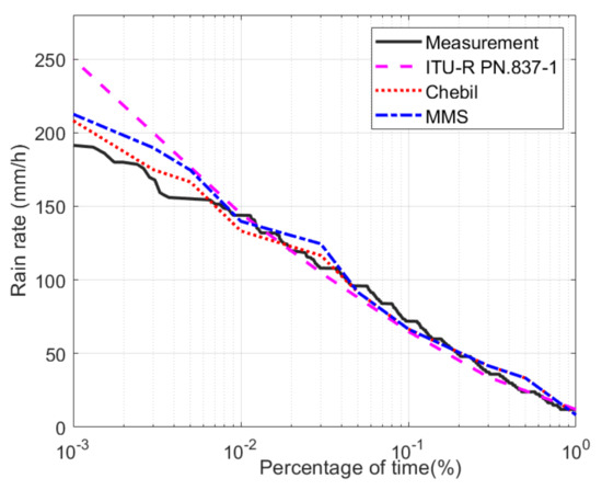 Figure 2 presents the cumulative distribution function (CDF) of the measured rain rate for every minute along a one-year period together with the ITU-R PN.837-1 model [27]. The experimental CDF is also compared with the CDF of rainfall 1-h integration time data collected from the Malaysian Meteorological Station (MMS) over a 12-year period [28]. Chebil and Rahman’s model [28] was used to convert these rain-rate data to the equivalent 1-min integration time. Finally, the measured CDF in the link area is also compared with the CDF of l-minute rainfall data measured over three years (June 1992 to May 1995) in Kuala Lumpur, Malaysia (308 N, 10139 E) using a tipping bucket rain gauge of 0.5 mm per tip [28]. It can be shown that the CDF of measured rain rate is very close to the ITU-R, MMS, and Chebil for any rain rates below 150 mm/h. The largest deviation between the CDF of the measured rain rate and the ITU-R model appears at low percentage of time (0.001%) with around 60 mm/h difference. However, the difference between the CDF of our measurements and the other measurement results—namely, MMS and Chebil—remains small (12 mm/h) even at these low percentages of time (0.001%).