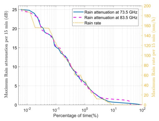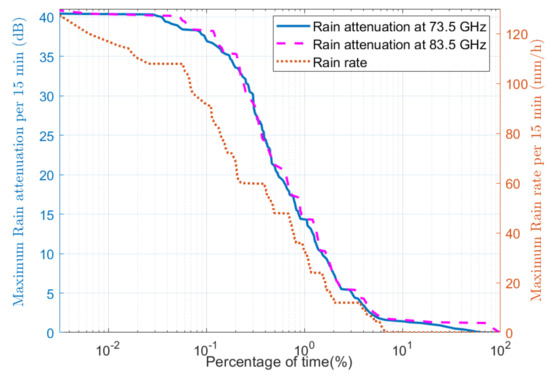 The difference between the minimum RSL under clear sky conditions and the minimum RSL under rainy conditions was used to calculate the rain attenuation. The difference between the RSL in the clear sky condition period and the RSL during the first hour after the rainfall has stopped represents the average wet antenna’s radomes effect. It was calculated to be 1.5 dB and excluded from rain attenuation [18]. The cumulative distribution functions (CDFs) for the maximum attenuation and maximum rainfall every 15 min in the 1.8-km 73.5- and 83.5-GHz LOS terrestrial link is shown in Figure 3. It shows that the rain attenuations are almost the same for both 73.5-GHz and 83.5-GHz E-Band links at all time of percentages. The maximum rain attenuation for both links is 40.10 dB at 0.03% of time. Our results agree with previous studies showing dominant and constant rain losses for microwave link with operating frequencies at 70 and 80 GHz bands [29,30]. From the rain-rate curve in this figure, it is worth noticing that for any rain rate above 108 mm/h, both links are down. It means that the two links can support the full-duplex transmission under rainy conditions with the outage probability of .
