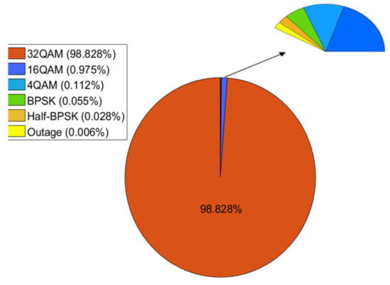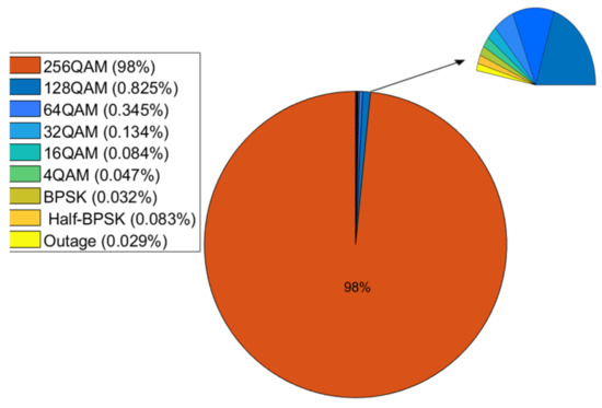 Each wireless back-haul link—either the one with the long path of 1.8 km or the short path of 300 m—can support up to 4.5 Gbps and 2.8 Gbps using 256-QAM and 32-QAM modulations under clear sky and light rain conditions. To maintain the link availability during heavy rain, the total throughput was sacrificed by reducing the number of transmission bits by applying the adaptive modulation technique. Detailed analysis for utilization of adaptive modulation modes along 1.8-km and 300-m links are shown in Figure 5 and Figure 6. Figure 5 shows that at 98% of time, the 1.8-km link is available using high-order modulation of 256 QAM to support the maximum throughput of 4.5 Gbps for the link. For short link of 300 m, Figure 6 shows that the link is available at 98.83% of time with 32 QAM (representing the highest order modulation for short link based on the link setup) to support the maximum throughput of 2.8 Gbps for the link. As both links of 73.5 and 83.5 GHz have the same performance of rain attenuation either in long distance (1.8 km) or short distance (300 m), the measured throughput represents the full-duplex wireless back-haul link.