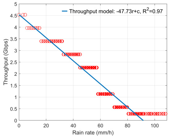 If we define the rain rate as variable r and maximum throughput as constant c, the measured throughput degradation with rain rate can be modeled as