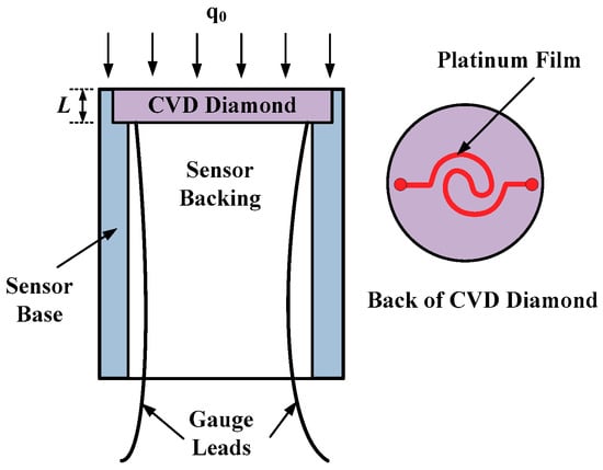 The structural diagram of the novel transient calorimeter (NTC) is shown in Figure 1. CVD diamond is selected as the calorimeter element. Firstly, the platinum film resistance is sputtered on the back of the diamond as the sensitive temperature measurement element. Subsequently, the calorimeter element is attached to the sensor base. The platinum film wire extends from the back of the calorimeter, and the bottom is filled with air or insulation material, which is usually epoxy.