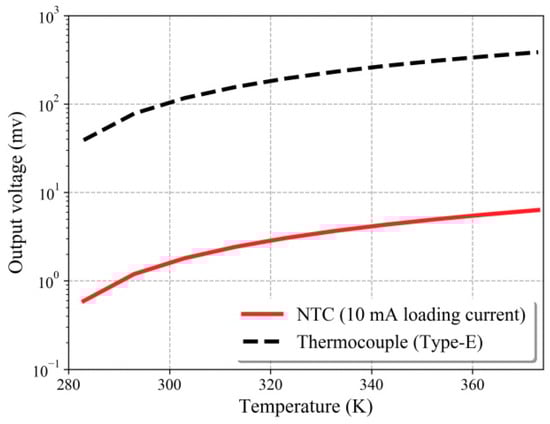 Output voltage of the NTC and Type-E thermocouple sensors.