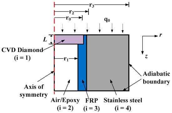where r and z are the radial and axial directions of the calculation model, respectively; the subscripts 1, 2, 3, and 4 represent the CVD diamond, air/epoxy insulation, fiber-reinforced plastics (FRP sensor base), and stainless steel (test model), respectively, as shown in Figure 4. Equation (4) is solved using the finite difference method for spatial discretization and a fourth order Runge-Kutta method for time integration [].