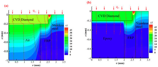 Figure 5 shows the simulated temperature distribution inside the calculation model for r0 = 2.5 mm at the moment of t = 12 ms; Figure 5a shows the results for the air as back-filling material, and Figure 5b depicts the result of using epoxy. As expected, a more complicated heat conduction process occurs around the CVD diamond. First, the temperature on the top surface of the computing model is not constant, and the smaller ρck value of the FRP results in a higher surface temperature than that of the CVD diamond and the stainless-steel model. However, air or epoxy has a lower temperature than the CVD diamond at the backside (around z = −0.2 mm in Figure 5). Thus, the thermal environment around the CVD diamond is complex; heat is absorbed laterally from the FRP at the surface region, but energy is dissipated to the bottom substrate. This result disagrees with the assumption of no heat loss from the CVD diamond element due to the different thermo-physical parameters of the CVD, FRP, air/epoxy, and the test model. However, this study did not specifically focus on the details of the thermal environment; instead, the performance of the sensor was analyzed by comparing the heat flux monitored at the back center of the CVD diamond (qb), as described by the nondimensional form of qb/q0, where the heat transfer rate q0 represents the heat flux applied to the model surface. Results for qb/q0 that are greater than one indicates larger measuring results, and vice versa. Values of qb/q0 that are closer to one indicate a smaller influence on the measurement results and vice versa.