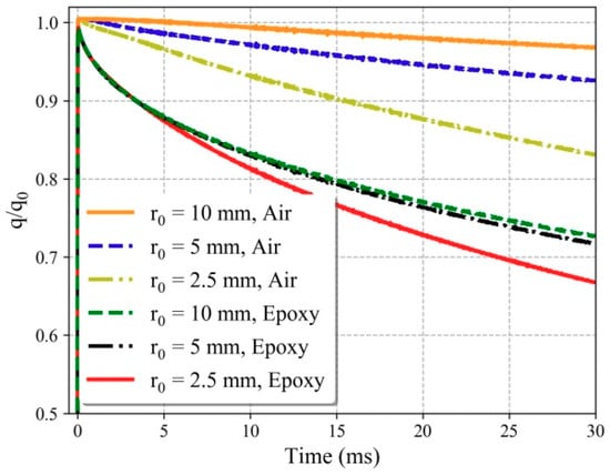 Figure 6 shows the heat flux calculation of the NTC sensor with different back-filling materials and different sensor sizes. Since the effective test time of impulse high-enthalpy faculties is usually very short, in the order of several microsecond. The discussion is mainly focused on 30 ms. For the sensor with air back-filling, the larger the sensor diameter, the larger qb/q0 is, and the smaller the influence on the heat flux measurements is. The size of the sensor with epoxy back-filling has little influence on the measurement deviation; all cases have lower values of qb/q0 than that of the air back-filling case duo the larger ρck of epoxy. For the sensor with air back-filling, at t = 30 ms, the heat flux error at the center position is 3.2% for r0 = 10 mm, and the errors are 7.4% and 16.9% for r0 = 5 mm and r0 = 2.5 mm respectively. The deviation is about 30% at t = 30 ms for all epoxy back-filling sensors. The main reason is the heat dissipation effect of the mounting base of the calorimeter. Due to the mounting structure, this measurement deviation is difficult to avoid. Unfortunately, all deviations increase with increasing time. Thus, a correction or calibration is needed to obtain high-accuracy heat transfer measurement results, especially for sensors with high ρck values.