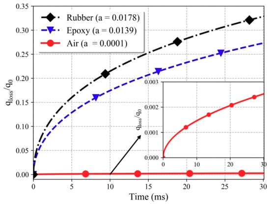 Figure 8 shows the relationship between qloss/q0 and time for three commonly used back-filling materials, where the calorimeter element is CVD diamond; its thermal diffusion coefficient can be found in Table 1. The larger the value of a, the larger the value of qloss/q0, and qloss/q0 increases over time. Of course, air is the best back-filling material of the calorimeter element, and its largest deviation is less than 0.3% (at 30 ms). However, the pressure resistance is poor when air is used as the back-filling material, which limits the application range of the sensor. This is especially the case in high-enthalpy flows, where small particles of metallic or nonmetallic materials exist. Epoxy is commonly used as a filling material for calorimeters to enhance the strength. Unfortunately, its heat flux loss is much higher than that of air, and qloss/q0 is more than 10% for a test time of 3 ms. Thus, corrections are needed if high-accuracy heat flux results are expected.