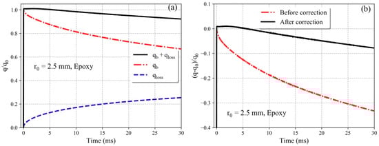 The parameters of epoxy in the simulation in Section 2.2 can be obtained from Table 1. The dynamic correction in Equation (14) was first used to correct the simulated results. The calorimetric element radius of r0 = 2.5 mm is used as an example; the calculation result in Figure 6 was modified using Equation (14), and the results are shown in Figure 9. The error before the correction is 33% at 30 ms, and the overall error after the correction is within 7.8%. This deviation is within 2.3% if the test time is smaller than 12 ms. Although only one-dimensional heat conduction is considered in the modification, it is found that the lateral heat flux loss from the CVD diamond can be ignored. The results are considered excellent for heat flux measurements.