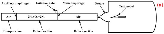 The calibration experiments were conducted in a shock tube/tunnel that uses detonation driving. The facility is located in the Laboratory of High-Temperature Gas Dynamics (LHD) at the Institute of Mechanics, Chinese Academy of Sciences, Beijing, China. A schematic of the shock tunnel is shown in Figure 10a. The system consists of a dump section, a driver section, a driven section, a hypersonic nozzle, and a test section. The dump, driver, and driven sections are 3, 15, and 11 m in length, respectively, and they have the same inner diameter of 224 mm. The test section is 10 m long and 1.2 m in diameter. The nominal Mach number of the nozzle is 5.5, and the nozzle exit diameter is 300 mm. Both the main and auxiliary diaphragms are flat-scored metal diaphragms. Different depths of the grooves are designed to ensure that they will not fail during initial pressure differences across the diaphragms before igniting the flammable gases. An ignition tube is placed close to the main diaphragm in the driver tube. The mixture in the ignition tube is initially ignited by electrical sparks. A high-temperature jet is formed and propagates into the driving section, thereby igniting the detonable gas directly. This leads to a stable detonation wave traveling upstream in the detonation tube, behind which a Taylor wave follows; the products have high temperature and pressure. Using detonation as the driving method, the facility can provide high-temperature gas conditions for hypersonic flight.