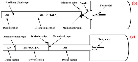 Schematic diagram of the experimental facility. (a) Detonation-driven shock tunnel; (b) Single detonation shock tunnel; (c) Detonation-driven shock tube.