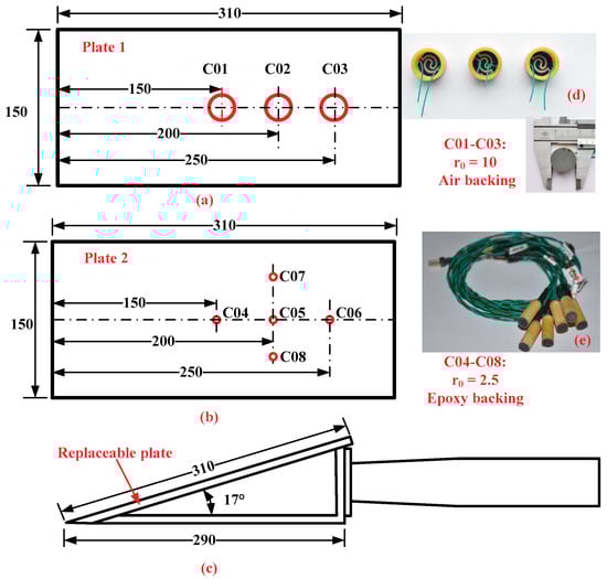 Test model and sensor configuration (units in mm). (a) Plate 1 with three NTC-10 sensors; (b) Plate 2 with five NTC-2.5 sensors; (c) the 17° angle wedge model; (d) photo of the NTC-10; (e) photo of the NTC-2.5.
