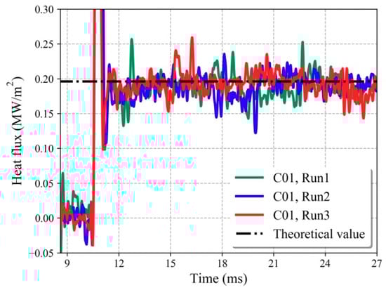 The repeatability of the experiments and the measurements was investigated. Figure 15 shows the obtained heat flux histories of C01 (NTC-10) for three measurements for the same nominal test conditions. The value between 15 ms and 25 ms in Figure 15 is used as the experimental heat flux. The relative standard deviation of the heat flux in the three tests is about 1.7%. The average heat flux amounts to 0.192 MW/m2. Table 3 summarizes the results of heat flux values obtained from the three NTC-10 sensors and the theoretical value. The experimental value is slightly lower than the theoretical value, which is due to the heat flux loss from the CVD diamond. The measurement deviations between the experimental and theoretical values are within 6%, and the relative standard deviations of all sensors are within 2%. Thus, the results show that the NTC sensor with air as a backing material provides acceptable results even without corrections, and the results correspond to the simulated results, as shown in Figure 6.