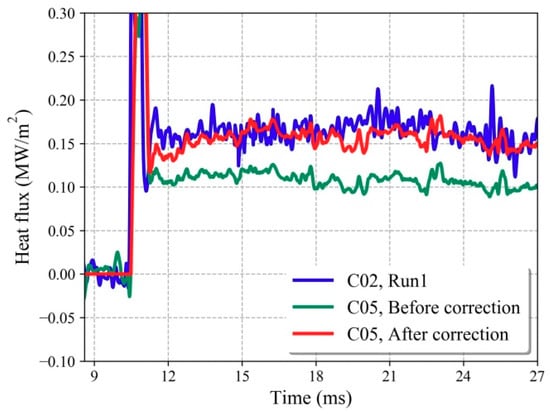 Subsequently, the heat flux curve of C05 in Figure 19 is corrected by Equation (14), and the results are shown in Figure 20. It should be noted here that the value of a is the value obtained from the results in Section 4.3.1. The corrected/uncorrected results of C05 are shown in Figure 20. The corrected results of C05 agree well with the heat flux of C02, which has a small deviation from the real heat flux loading, as discussed in Section 4.3.1. Thus, the dynamic correction method for the NTC sensors shows good performance, even for a test duration as long as 30 ms.
