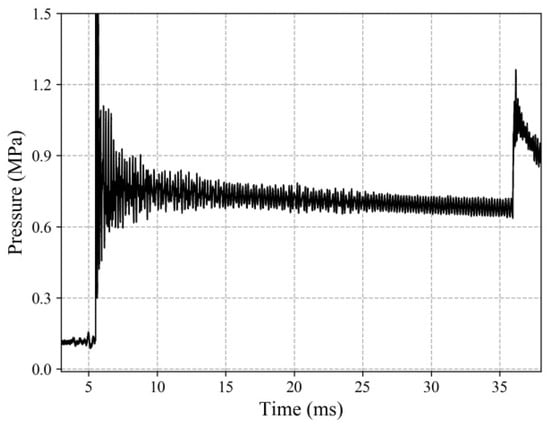 In the detonation shock tunnel, a mixture of 2H2 + O2 + 2N2 was used as the initial driver gas, and air was used as the initial test gas in the driven section. The initial pressure values were 0.27 MPa and 3800 Pa, respectively. The test parameters are listed in Table 2; the total pressure was 1.22 MPa, and the temperature was 3570 K. The reservoir pressure was measured using pressure transducers mounted at the end of the shock tube. The other reservoir parameters were computed using the measured shock tube filling pressure, shock speed, and nozzle reservoir pressure. The stagnation pressure history is shown in Figure 13. The plateau pressure is maintained for about 14 ms. Based on the reservoir conditions, the free-stream was subsequently determined by numerically rebuilding the nozzle flow [].