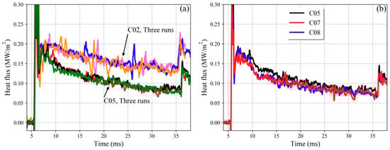 Heat flux curves. (a) C02 (NTC-10) and C05 (NTC-2.5) for three test runs; (b) C05, C07 and C08 in Run 1.