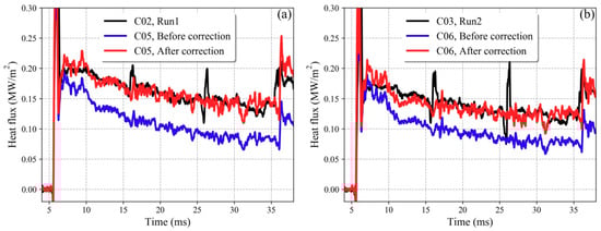 Heat flux curves with/without corrections. (a) Comparison of C02 (NTC-10) and C05 (NTC-2.5); (b) Comparison of C03 (NTC-10) and C06 (NTC-2.5).
