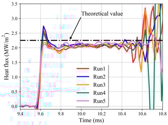 Since the shock tube allows for more quantitative studies than the other tests and the free-stream flows can be accurately obtained through the shock tube theory, the calibration of the sensors was also conducted using the detonation shock tube. However, the test time in the shock tube is much shorter than that of the other tests. Due to the test space limitation of the shock tube, only two NTC-2.5 sensors (C05 and C06) were installed on two R20 spheres; the sensor arrangement is shown in Figure 12. Five tests were conducted. The measured heat flux curves for C05 are shown in Figure 21, where the heat flux of NTC-2.5 is corrected in the same manner as described in Section 4.3.2. However, since the test time was less than 1 ms, the corrections were also very limited, and the discrepancy was 6% at most, as shown in Figure 8. The heat flux curves show excellent repeatability, similar to the other tests.