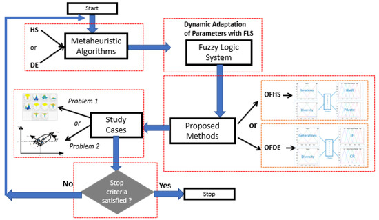 Therefore, the main contribution in this paper is that the proposed method uses the original DE and HS algorithms to find the best architecture of the previous fuzzy differential evolution (FDE) and fuzzy harmony search (FHS) fuzzy systems shown by Castillo et al. in [46], which are responsible for adjusting parameters along the iterations. The proposed methods are optimized fuzzy differential evolution (OFDE) and optimized fuzzy harmony search algorithm (OFHS). Once the best architectures of the proposed OFDE and OFHS algorithms have been found, two types of problems are considered for optimization: benchmark mathematical functions and a non-linear control problem. Figure 1 shows the general diagram of the proposed method in this paper.