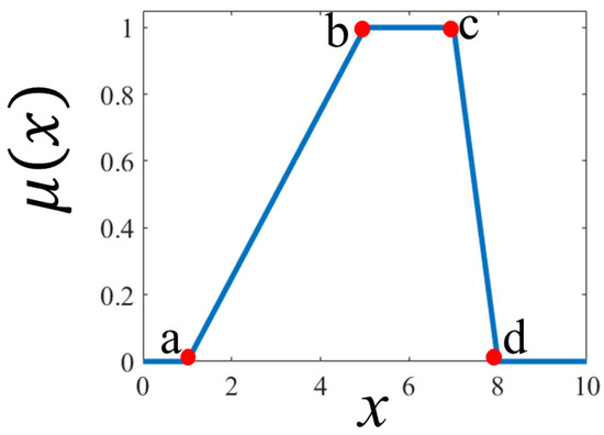 One of the membership functions used in the controller is the trapezoidal one, which has four scalar parameters—a, b, c, and d as given by the Equation (18), where a and d represents the lower corners of the trapezoid and the b and c locate the shoulders. To represent the graphical form of the trapezoidal membership function, we illustrate it in Figure 7.
