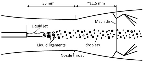 The behavior of liquid drops introduced into a gradually accelerating air flow in a converging–diverging nozzle was investigated. A converging–diverging nozzle with a rectangular cross-section and a throat size of 8 × 10 mm was employed for the study. Optical access to the measurement area was provided by transparent flat side walls of the nozzle. A compressor supplied constant airflow through the air supply line at the rate of 36 L/s. Air flow temperature and pressure were measured in the settling chamber preceding the converging part of the nozzle. The nozzle was operated in a choked regime with the formation of a Mach disk inside the divergent part of the nozzle, at a distance of 11.5 mm from the nozzle throat.