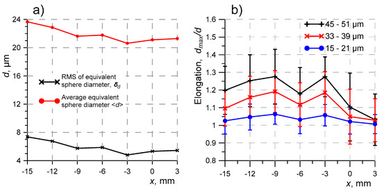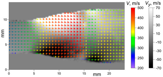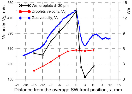 Figure 5. As droplets’ acceleration depends on their size, manual evaluation of velocity for droplets of different sizes in shadow images was performed. At the distance of 3 mm upstream of the average SW front position, the average velocity of 45 µm droplets was 275 m/s, while for 15 µm droplets, it amounted to 305 m/s. Therefore, an error introduced in the estimation of local