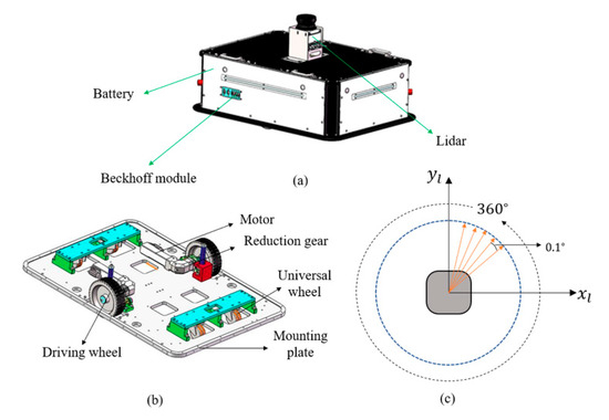 The robot model is composed of a two-wheel driven mobile robot and a 2D Lidar, as shown in Figure 1a. The two-wheel driven mobile robot mainly include the following parts of Beckhoff module and the hardware (Figure 1b, such as two driving wheels, universal wheels, and so on. The whole system is electrically powered by lithium-ion batteries, which enable it to operate for about 6 h. The drive system can achieve a maximum speed of 2 m/s on flat terrain. The Beckhoff module is a control system to implement the planning task from the upper computer via a wireless router. The Beckhoff is also a microcomputer, and it runs a real-time enabled version of windows with the visual studio. Also, a 2D Lidar that shown in Figure 1c is attached to the center of mobile robot, and it can rotate anticlockwise with the 360 degrees coverage field around the vertical line of the mobile robot. The resolution of 2D Lidar is 0.17 degrees, and it can perceive scanning information from the environment up to 30 m. In addition, the ultrasonic and inertial measurement unit are also equipped with the mobile robot.