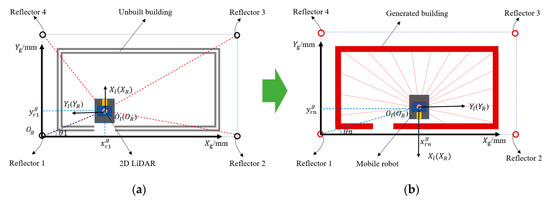 For improving the quality and efficiency of building construction, a 2D drawing of the ongoing building is designed by the CAD software [4,37]. From the top view of Figure 2, the actual operating range adopts a 1:1 scale to consist with the drawing, and as a digital model to the mobile robot [36,38]. Then, the artificial landmarks with high reflectivity films are set in the ongoing scene, and the intensity information of them are extracted to determine the initial position of the mobile robot. Finally, according to the sequence of the ongoing buildings, the scanning matching algorithm based on generated buildings is proposed to achieve the localization of mobile robot. The Figure 2 shows a construction process of the ongoing scene for the mobile robot.