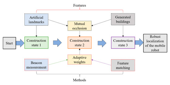 For the localization of mobile robot in the ongoing scene, the paper starts from the construction process with the clockwise sequence. When the generated buildings were constructed according to the scale of the construction drawing, the scene was divided into three construction states (Figure 3). Due to the mutual occlusion of artificial landmarks and generated buildings, their geometrical characteristics in different locations were extracted, respectively. Considering the quantitative differences between the two characteristics, the weighting factors were set relatively and the MALOBAL method was proposed to achieve the robust localization. Taking the construction from scratch to completion as an example, the localization process of mobile robot is shown in Figure 3.