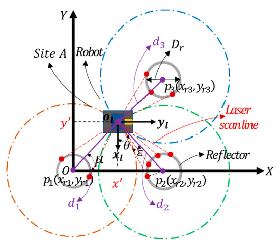 When the number of reflectors that scanned by the Lidar is greater than or equal to three, the three-sided measurement is used to realize the localization of mobile robot. In addition, [13] concludes that the more artificial landmarks are set in the indoor environment, the localization accuracy of mobile robot will be higher. However, when the number of artificial landmarks is set too much, the difficulty in identifying them increases and the anti-interference ability will be weakened accordingly. Therefore, in this paper, four reflectors are evenly placed in the ongoing scene, and the trilateration method is used to complete the localization of mobile robot. The parameter definition of Figure 4 is