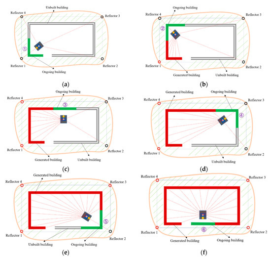 Localization flowchart of mobile robot at locations of ①~⑥. (a) The initial location ① of the ongoing scene; (b) The working location ② with artificial landmarks and ongoing buildings; (c) The working location ③ with artificial landmarks and ongoing buildings; (d) The working location ④ with artificial landmarks and ongoing buildings; (e) The working location ⑤ with artificial landmarks and ongoing buildings; (f) The last working location ⑥ of the ongoing scene.
