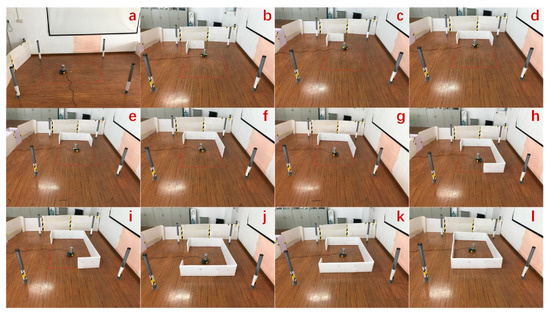 In order to verify a better robust localization of mobile robot in the ongoing scene, this paper proves the superiority of the localization method proposed in the paper from the workflow of (a) to (b) (Figure 7). Firstly, a 1:1 construction scale based on construction drawings is set, and the length and width of the construction site is . Secondly, in the ongoing scene, four reflectors with high reflective strength film materials are set in the scene to determine the initial working location of mobile robot, and then six working locations are also selected in the paper according to the clockwise construction sequence of the buildings. Finally, the paper selects the white plate as the ongoing features of the scene, and adopts a mobile robot equipped with Lidar to test the localization algorithm. The specific construction process is shown in Figure 8a–l.