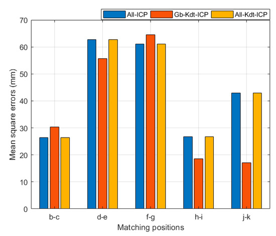 According to the matching results of mobile robot at the five working locations in Table 2, the values of mean square error and calculation efficiency that based on three matching methods are obtained, as shown in Figure 9 and Figure 10. Figure 9 shows that the Gb-Kdt-ICP algorithm based on ongoing buildings can achieve better matching results than the methods of All-ICP and All-Kdt-ICP during the matching process of d-e, h-i, and j-k locations. The minimum value of matching mean square error is 17.15 mm. Similarly, in the matching of locations b-c and f-g for mobile robot, the Gb-Kdt-ICP algorithm proposed in this paper performs poorly. It has a larger matching error than the All-ICP and All-Kdt-ICP algorithms. In short, when the number of ongoing buildings in the scene gradually increases, mobile robot extracts the building features of the scene, and the localization error of it is reduced from the working locations h-i-j-k, the localization accuracy of mobile robot is gradually improved. Similarly, from Figure 10, it can be seen that the time-consuming of the All-Kdt-ICP algorithm is 0.052 s, and the Gb-Kdt-ICP algorithm is 0.027 s. Thus, it shows that the Gb-Kdt-ICP algorithm based on the generated buildings that proposed in this paper has a higher calculation efficiency. Compared with the All-Kdt-ICP algorithm, the calculation efficiency of Gb-Kdt-ICP is approximately increased by 2 times. It is more conducive to the localization application of mobile robot in actual scenes.