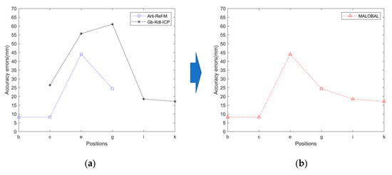 Localization errors of mobile robot at different operating locations (b-k). (a) The accuracy errors of two methods of Arti-Ref-M and Gb-Kdt-ICP; (b) The accuracy error of MALOBAL method that proposed in the paper.