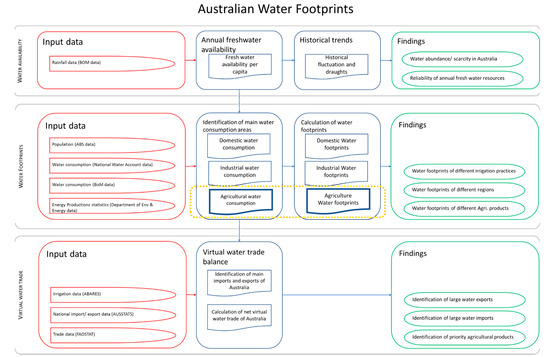After the analysis of freshwater availability, a detailed analysis of water footprints of major water consuming sectors was carried out. The proposed methodology is explained in Figure 2. A standard water consumption accounting for the domestic and industrial sectors was conducted; however, a detailed and thorough analysis for major crops was performed at the regional level due to high water consumption in the agriculture sector. Australia has one of the highest negative balances of green water, mainly due to its exports [30]. Hoekstra et al. [8] determined the water footprints of Australia at the national level and found that the internal water footprint for domestic water is 341 , and for industrial is 64 internal and 211 external, whereas for agricultural products it is 736 internal and 41 external. Therefore, recalculating the internal and external water footprints is beyond the scope of this research.