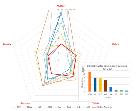 Population and water consumption data was collected from the National Water Account and the Australian Bureau of Statistics (ABS) [31] to perform the domestic water consumption accounting. Calculation of water use per capita highlighted the states with higher water consumption. The data for end water usage was collected for the states of Northern Territory (NT), Victoria (VIC), Western Australia (WA), Queensland (QLD), and New South Wales (NSW). The states of NT, VIC, and QLD however, only had data available on a city basis; this data was for the largest cities in the state therefore was an accurate representation of water usage trends within the states. Domestic water usage (12%) is a relatively minor portion compared to the agricultural and industrial sectors. However, due to its nature of use and based on direct stakeholders, urban water footprints have the highest priority. Excluding NT and WA, the remaining six states have a mean usage of 74,186 L per capita per year (LCY) (refer Figure 3) which is higher than the global average footprints of 57,000 LCY. WA and NT demonstrate much higher water consumption of 127,929 LCY (72% higher than the middle band average of other states excluding these two) and 158,407 LCY (114% greater than the middle band average of other states excluding these two), respectively. NT and WA have potential to reduce water consumption. Further investigation revealed that the lifestyle of these two states is characterized by larger houses with green areas that need a substantial amount of water for gardening [32]. End water usage data shows that Darwin and West Australia use 70% and 50%, respectively, of domestic water for outdoor use, whereas Brisbane and Melbourne use 5% and 18%, respectively [33].