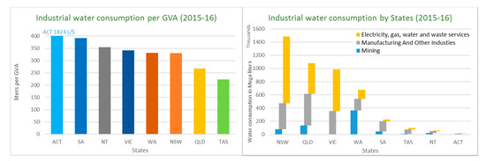 Industrial water consumption (ML) per industry and per Gross Value Added (GVA) excluding agriculture (thousand $) by each state (2015–2016) on left and total consumption by each sector on right (Data source: Australian Bureau of Statistics, 2017).