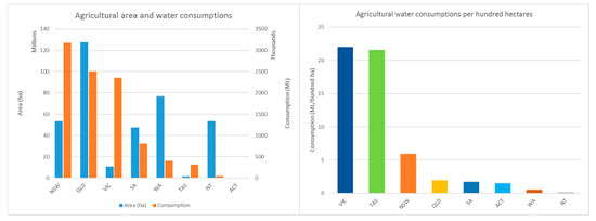 The main part of the water usage in the agricultural industry is used for irrigation purposes, representing more than 85% of the total water consumption in the agricultural sector. The remaining 15% is used for other agricultural purposes such as drinking water and cleaning. According to the Australian Bureau of Statistics, NSW was ranked as the state with the largest agricultural water consumption, being just higher than QLD and VIC for the period 2014–2016 (refer to Figure 5). The percentage of land use for agriculture is 58% in Australia. The agricultural activities are driven by the climate, economy, water availability, and soil conditions. The low consumption rate of NT is mainly because 99.5% of the agricultural area is grazing native vegetation [46]. The state experiences a high fluctuation in rainfall, because of which the limited crop production activities use groundwater (82%) [47]. As such, although it may appear that TAS and VIC use more water, they may achieve better yields from the area farmed. This highlights the need to compare each crop individually in addition to comparing the yield for the relevant crop.