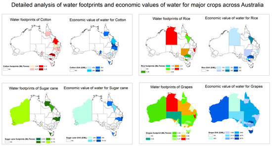 Detailed analysis of water footprints (red shades are above the global average and green are below the global average) and economic value of water for major crops in Australia.