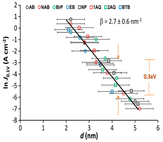 - Yan, H.; Bergren, A.J.; McCreery, R.; Luisa Della Rocca, M.; Martin, P.; Lafarge, P.H.; Lacroix, J.C. Activationless charge transport across 4.5 to 22 nm in molecular electronic junctions. Proc. Natl. Acad. Sci. USA 2013, 110, 5326. [Google Scholar] [CrossRef]