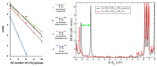 - Wang, W.; Lee, T.; Reed, M.A. Mechanism of electron conduction in self-assembled alkanethiol monolayer devices. Phys. Rev. B 2003, 68, 035416. [Google Scholar] [CrossRef]