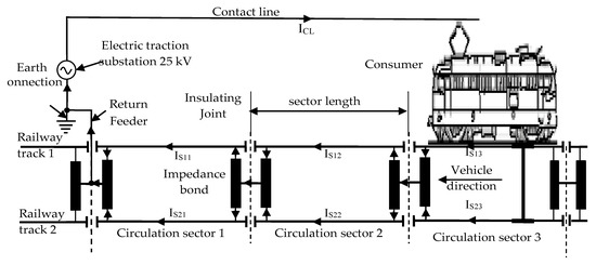 Generally, the return circuit is composed of all conducting paths (railway tracks, impedance bonds, connecting conductors between the railway tracks, and impedance bond, return feeders) that form the return path of the traction current to the power supply substation [32,33].