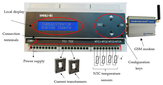 Figure 5 shows the frontal image of the embedded system. Thus, the connection terminals, the configuration keys of the device, the local display, GSM modem, etc., can be observed. The hardware architecture of the device was designed for specific working conditions to electric traction, being made a compact and robust structure, suitable for insertion in housing that can be mounted on the omega rail, the rail commonly used in switchboards.
