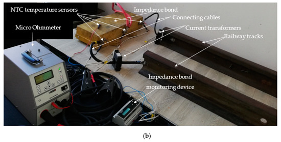 In conclusion, monitoring and diagnosis must allow good knowledge of the impedance bonds’ technical conditions to retain their behavior in the most varied situations (i.e., temperature in the contact areas, the current imbalance through the two railway tracks, the interruption of the connecting conductors between the impedance bond terminals and railway tracks, etc.), and compare it with a database of other impedance bonds of the same type, but exposed under similar conditions. This fact is of great importance because the data obtained by impedance bond monitoring will prevent the occurrence of electrical traction installations malfunctions.