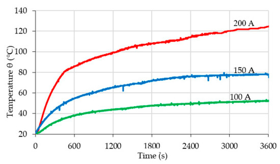 Figure 9 shows the temperature variation in the terminal contact area of the impedance bond when it is connected by a steel rope to the railway track, at the same values of the currents as the other cases. The temperature reaches to 52.5 °C, for a current of 100 A, 78.5 °C for 150 A, and 124.4 °C for 200 A. Moreover, the temperature in the terminal contact area has different evolutions due to the current values; the contact resistances, having almost the same values, do not influence the measurements.