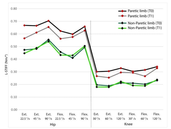 According to results in Table 2 and Figure 1, the stiffness values of the paretic legs were greater than those of non-paretic legs during the basal assessments (T0) and these stiffness differences were statistically significant (p < 0.05); except for knee flexion at an angular velocity of 30°/s that showed non-significant stiffness differences. Analogous results were observed at one-month follow-up (T1) where the stiffness values of the paretic legs were greater than those of non-paretic legs and these stiffness differences were statistically significant (p < 0.05); except for hip extension at 22.50°/s and at 90°/s that showed non-significant stiffness differences. The stiffness values of the paretic legs at one-month follow-up (T1) were lower than those at basal assessment (T0) but this decrease was not statistically significant. The stiffness values of the non-paretic legs at one-month follow-up (T1) were lower than those at basal assessment (T0) for hip extension at 22.50°/s and 90°/s, hip flexion at 22.50°/s, knee extension at 30°/s and 60°/s, and knee flexion at 30°/s and 60°/s and the stiffness values were greater for hip extension at 45°/s, for hip flexion at 45°/s and 90°/s, knee extension at 120°/s, and knee flexion at 120°/s but these value differences were not statistically significant.