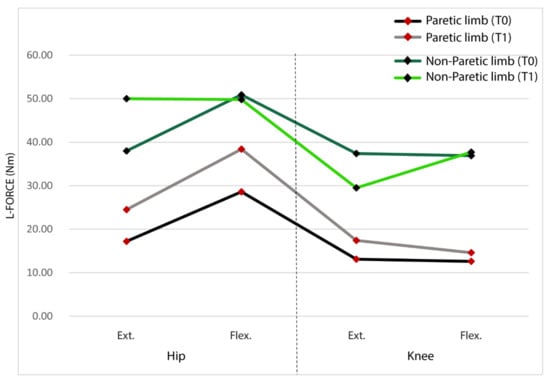 Table 3 shows the mean of the L-FORCE measures (joint torque assessment) for the paretic and non-paretic lower limb at basal assessments (T0) and at one-month follow-up (T1). In addition, Table 3 presents the significance values (p-value) estimated using the Wilcoxon signed-rank test by comparing the L-FORCE values obtained for the paretic and the non-paretic legs, at T0 and T1, as detailed in the footers of the same table (Table 3). Figure 2 shows a plot of the mean measures of the L-FORCE obtained for paretic and non-paretic limbs at T0 and at T1.