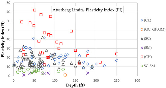 Consolidation tests were conducted following ASTM D3550 [40] specifications using ring samples on the undisturbed samples. Atterberg limits were performed according to the ASTM D4318 [41] standard. The reported plasticity index is shown in Figure 1. In addition, the direct shear test, in accordance with ASTM D3088 [42] specifications, indicated that the average friction angle ranged between 20 and 35 degrees, and the cohesion varied within the 200 to 300 and 400 to 500 psf for the clayey sand and lean clay/fat clay soils, respectively. Las Vegas soil stratigraphy consists of seven main soil types including clayey Sand (SC); silty sand (SM); lean clay with traces of caliche or gravel (CL); fat clay (CH); sand and gravel (GP, GM, GC); and cemented layers, such as cemented sand and gravel. The characteristics of each mentioned soil type can vary within the depth in the site location.